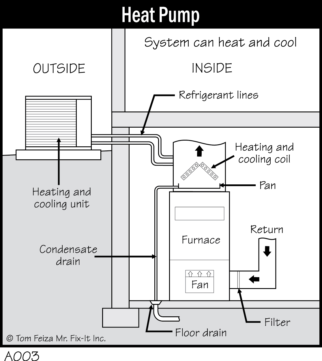 When the thermostat signals for cooling, this starts up the exterior refrigeration compressor, exterior fan and furnace fan. The exterior compressor moves refrigerant through the closed system of coils and valves to produce a cool coil inside.The furnace fan moves air across this coil. The air cools, and moisture condenses on the coil’s surface. This moisture is caught in a pan below the coil and drains away through a hose.
